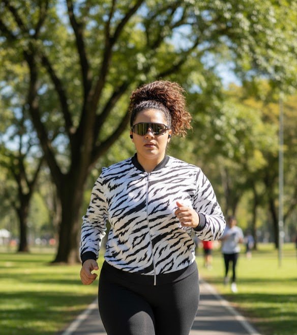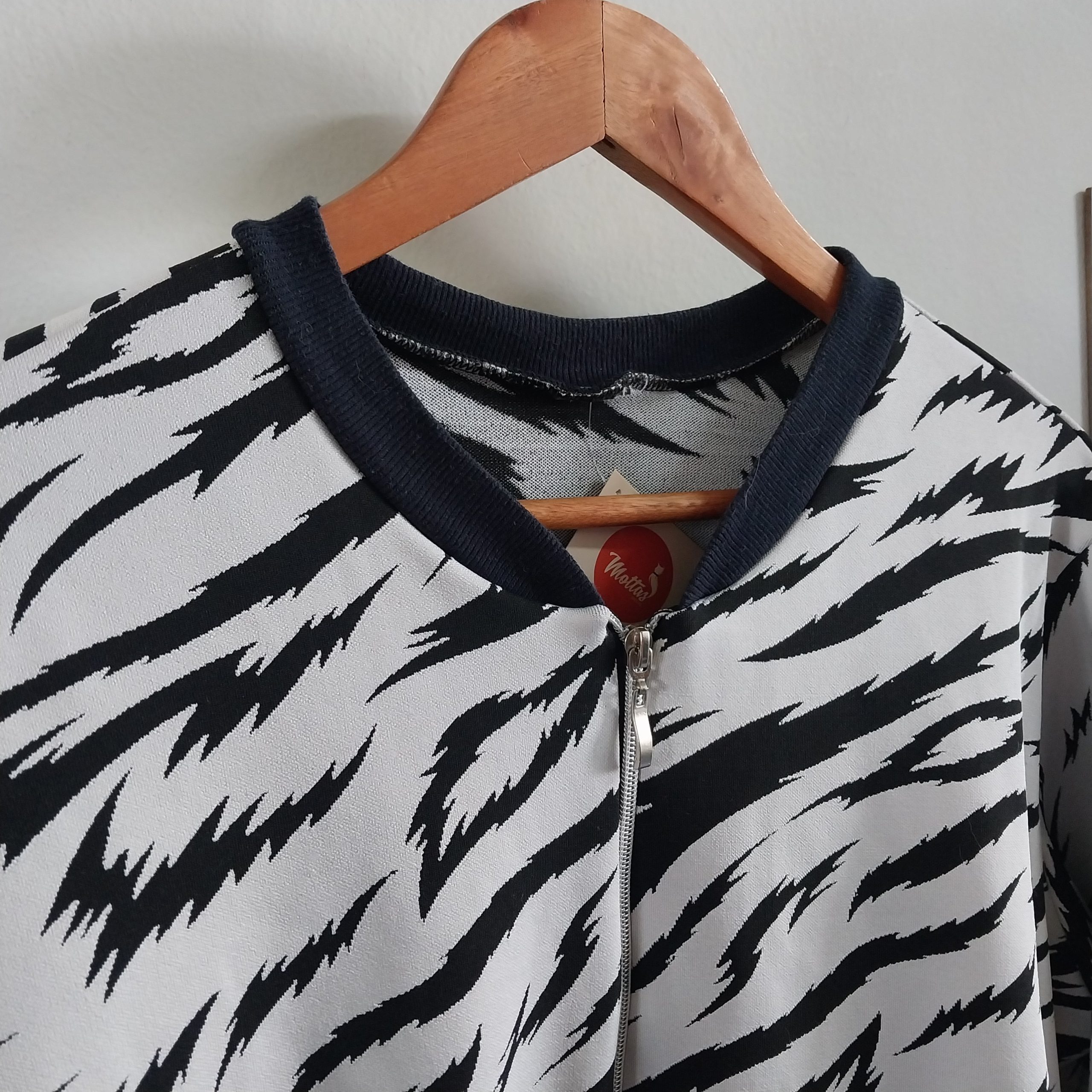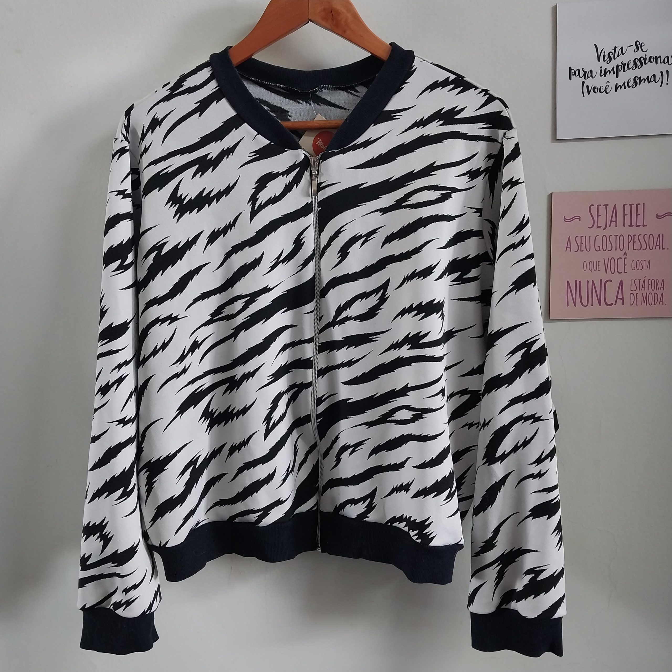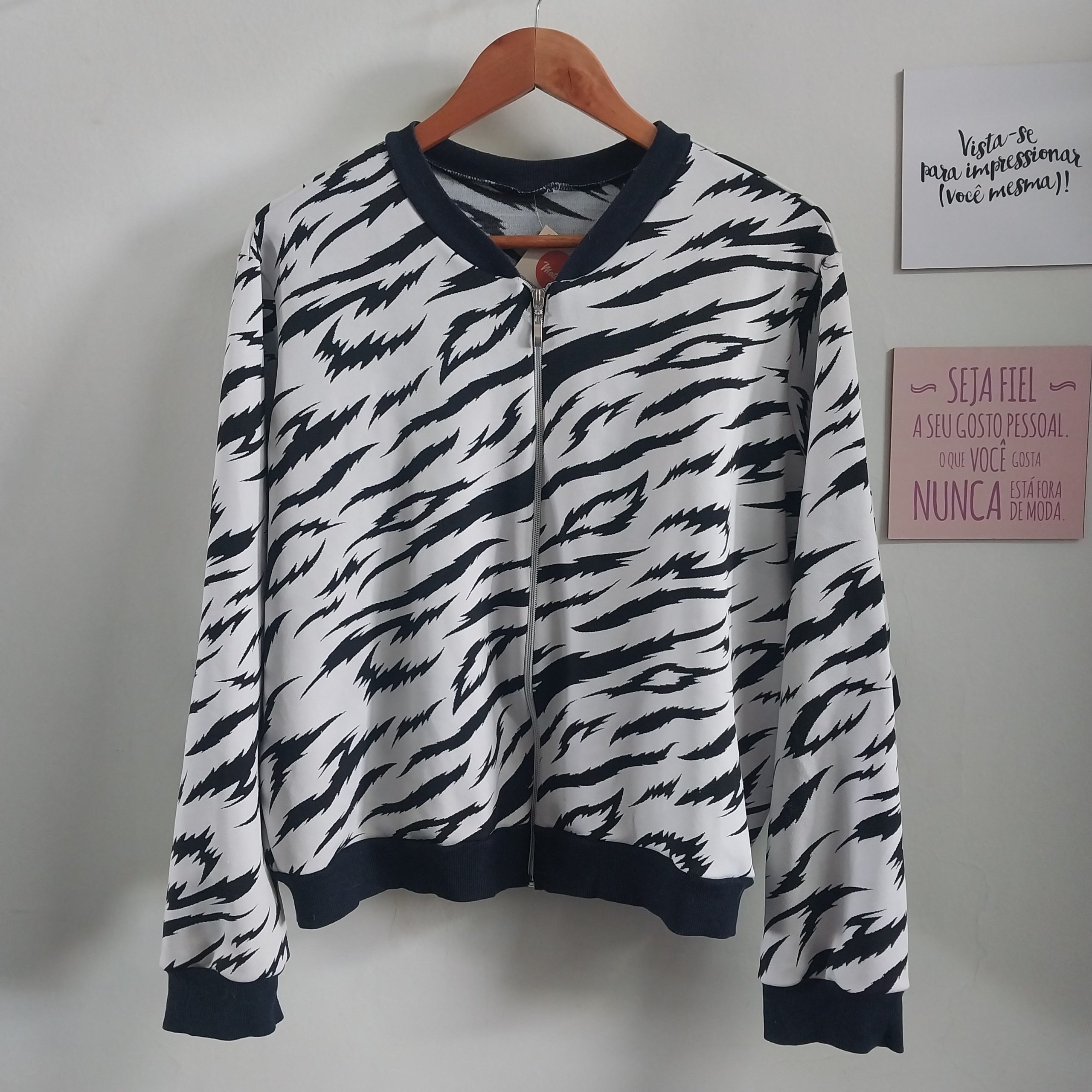 Casaco animal print, preto e branco, em malha de poliéster texturizada, fecho eclair metálico, com golas e punhos na cor preta. Pode ser usado para práticas esportivas ou compondo looks mais casuais. Tam G2 – Veste do 46/48.(MBQB281)